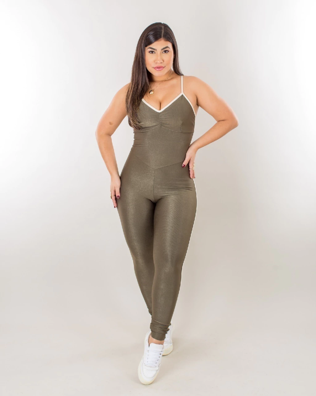 - *Tecido:* O macacão é confeccionado em Power, um material leve, respirável e elástico, que oferece excelente suporte e liberdade de movimento. O tecido é conhecido por sua durabilidade e capacidade de manter a forma, mesmo após intensas atividades físicas.